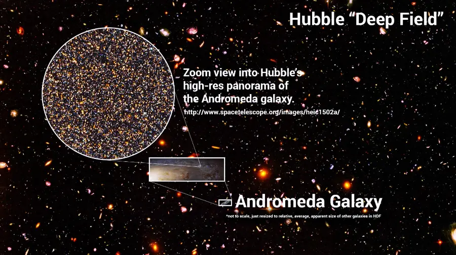 허블 우주망원경이 촬영한 첫 딥필드에는 단 한 구역에서만 수천 개의 은하가 담겼다. 이를 전체 하늘에 비유하면, 우주에 존재하는 은하는 최소 수천억 개 이상이라는 계산이 나온다.