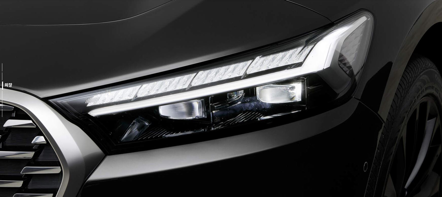 전면의 V자형 세로 패턴 그릴은 위엄 있는 인상을 부각시키며, 풀 LED 헤드램프는 슬림하지만 강렬한 인상을 줍니다.